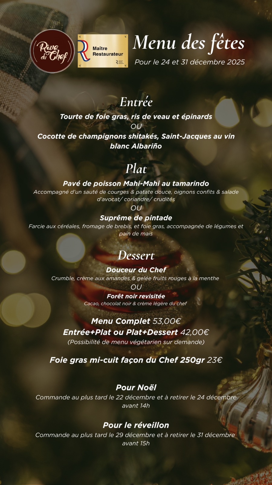Entree du jour +Plat du jour + Dessert du jour ou glace du chef ou salade de fruits